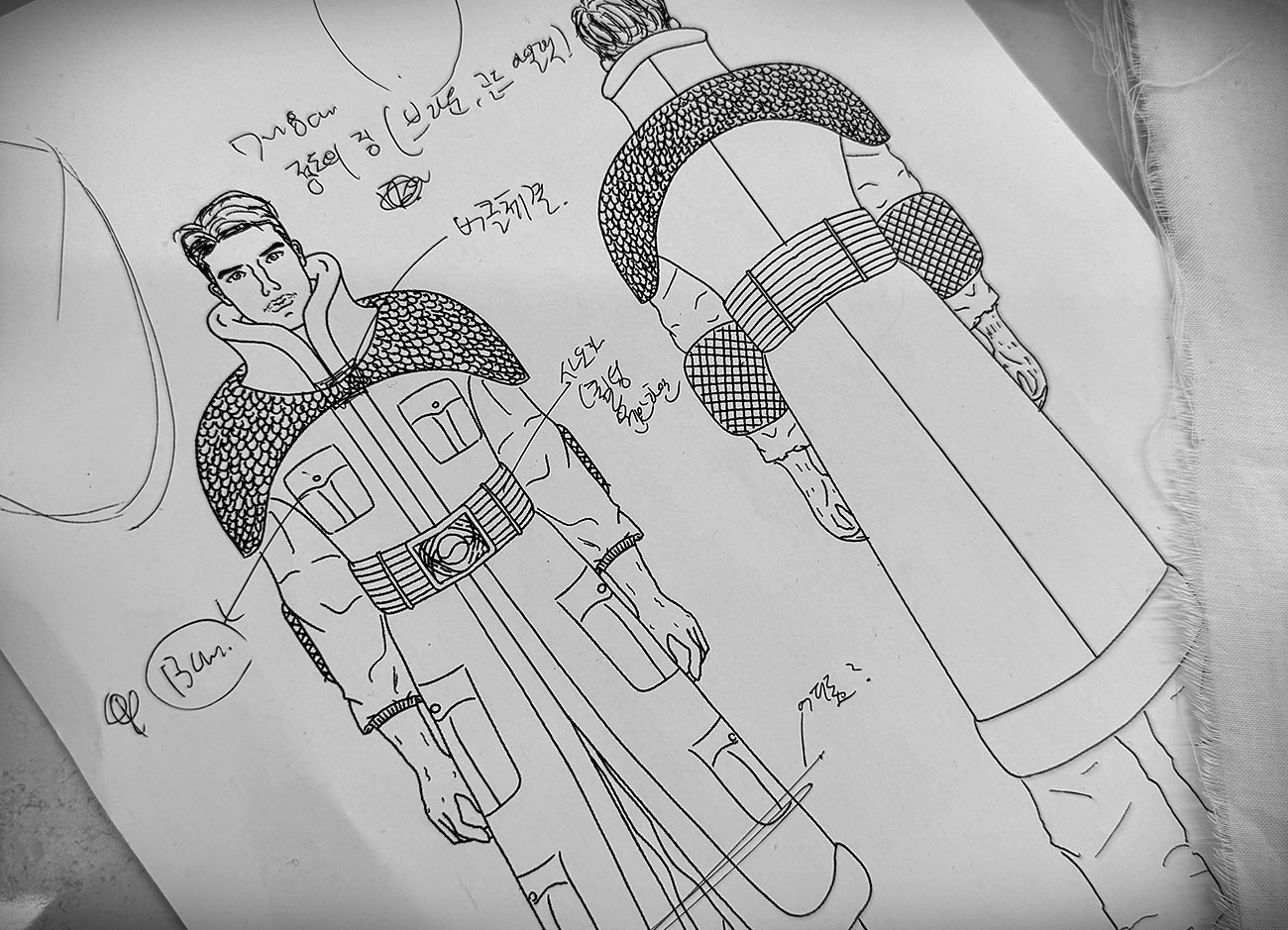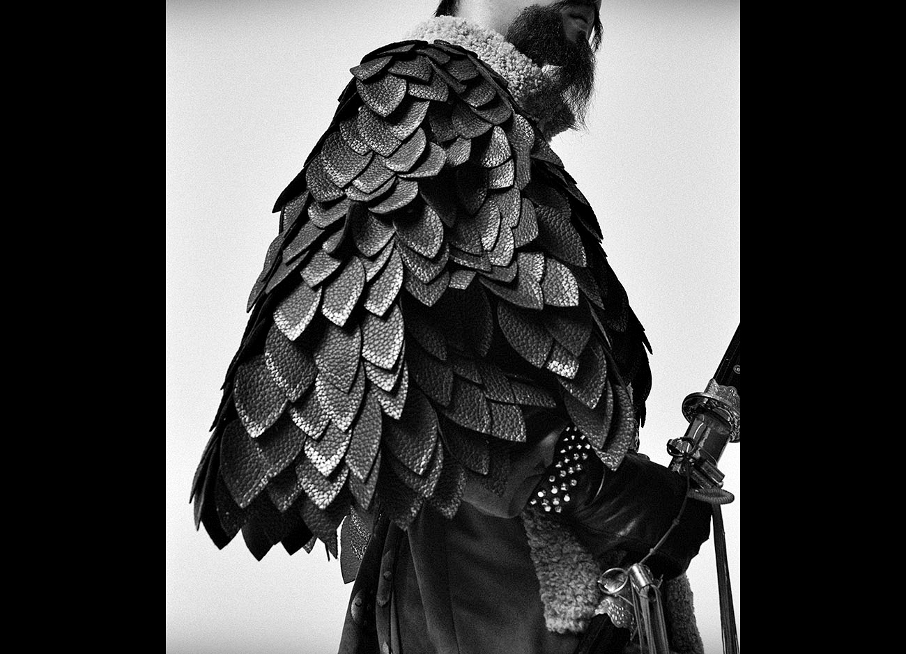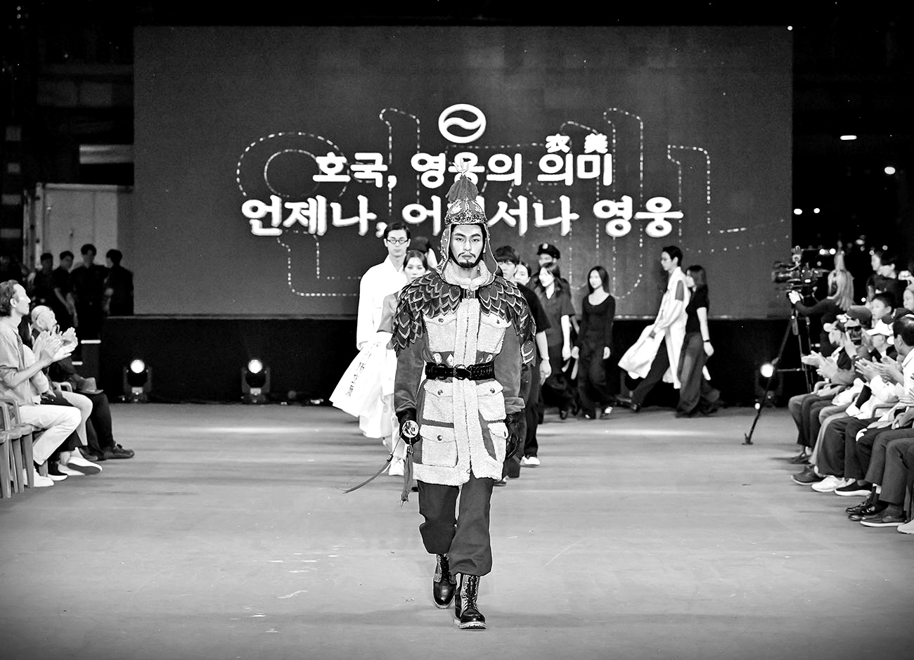 <장군>은 대한민국의 영웅, 충무공 이순신 장군의 굳건한 정신과 강인한 리더십을 현대적인 패션 언어로 재해석한 작품입니다. 해당 작품은 이순신 장군의 기개와 결단력을 고스란히 담아내고 있으며, 외형적인 재현과 함께 그의 풍채와 화려함을 담아 경외감을 자아내었습니다.