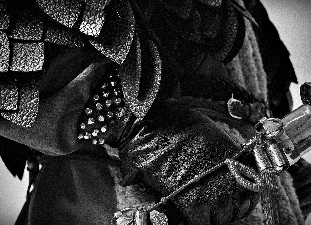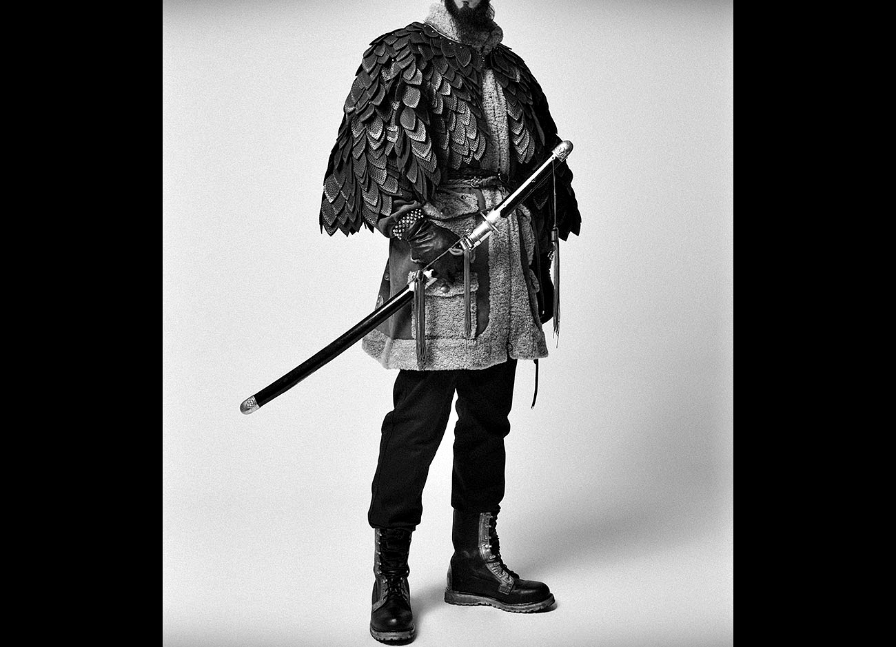 Fur-trimmed Military Coat / Leather Pieces Embellished Shawl / Layered Belts / Cotton Trousers / Gold Painted Boots