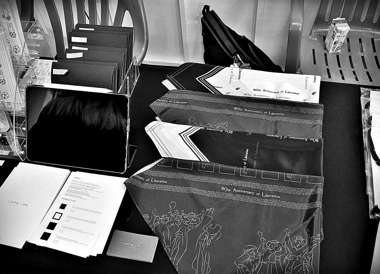 광복80장터의 구포장터 부스에서는 보훈외교단을 중심으로 모집된 7명의 대학생들이 광복80주년의 의미를 되새기며 직접 디자인하고 제작한 물품들이 판매되었습니다. Larina Lino KIMSOOHYUN은 호국보훈과 상품성을 매력적으로 녹여낸 디자인을 만들기 위해 마켓 준비 단계부터 국가보훈부와 긴밀히 소통하는 작업을 거쳤습니다. 구포장터에서 판매된 스카프, 키링, 파우치, 스티커 등 모든 상품들은 피드백과 예산 심의를 거쳤으며, 광복과 독립의 요소가 디자인 곳곳에 활용되었습니다.