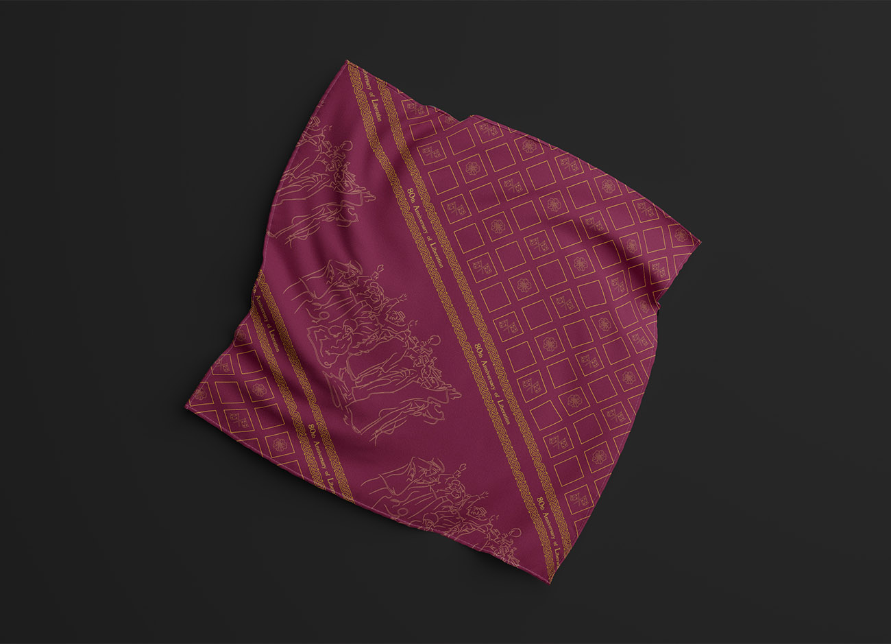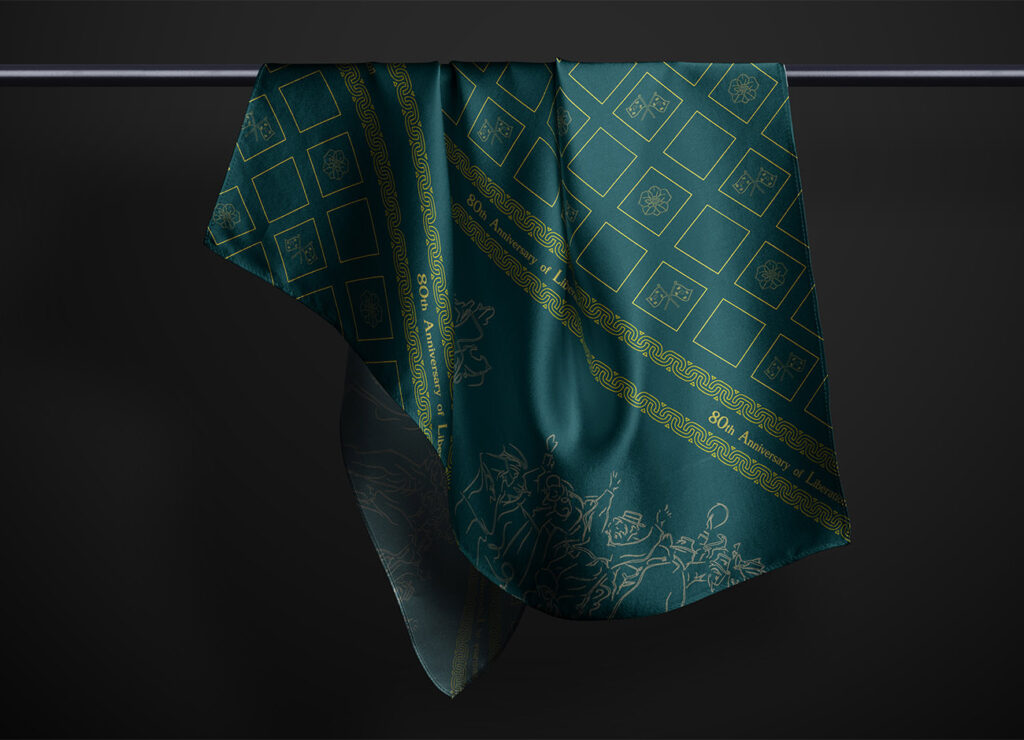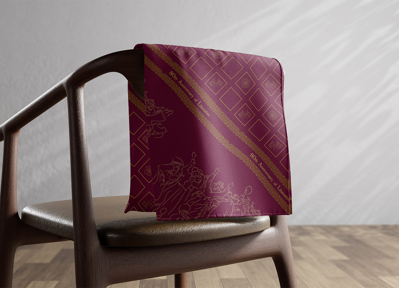 Scarf 02는 유명한 독립운동 중 하나인 3.1운동을 디자인 모티프로 활용한 정사각 스카프입니다. 스카프 중앙에는 3.1운동 현장 사진을 레퍼런스로 하여 러프한 터치와 불규칙한 곡선을 담은 추상적인 판화와 같은 패턴이 위치합니다. 스카프 양 극단은 태극기와 무궁화의 아이콘을 정사각 반복 문양에 담아 전통적이고 동양적인 면을 강조하였으며, ‘80th Annniversary of Liberation’ 타이포그래피를 감싼 체인장식이 스카프 중앙을 가로지르며 독창적이고도 신비로운 분위기를 자아내도록 설계하였습니다. 착용자는 타이포그래피와 3.1운동 드로잉을 전면으로, 혹은 사각 무궁화&태극기 패턴을 전면으로 착용하여 색다른 멋을 연출할 수 있습니다.