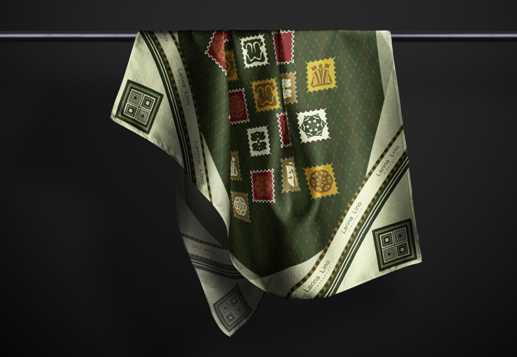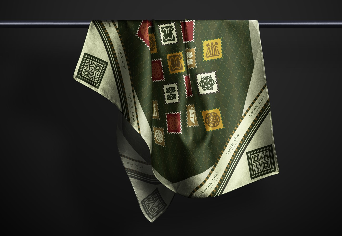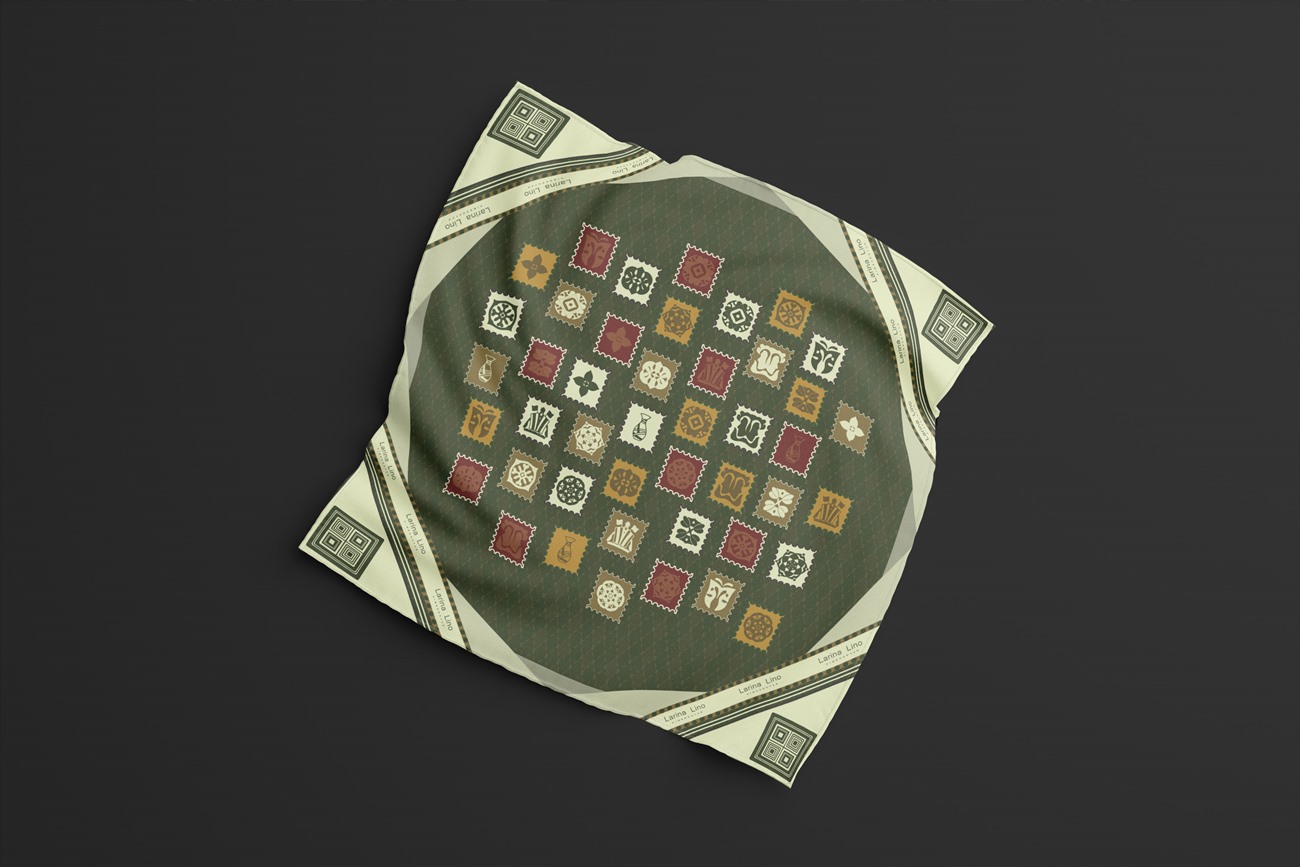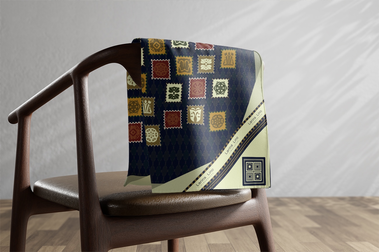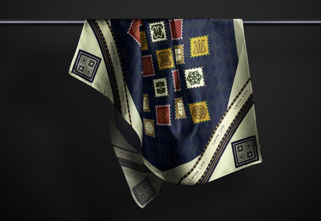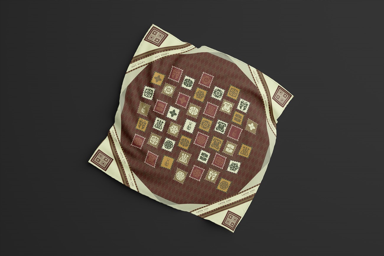 Larina Lino 개인 스카프 디자인의 첫번째 작품입니다. Larina Lino의 중요한 철학 중 하나인 예측불가능한 곡선의 추상적인 이미지들을 우표 디자인으로 익살스럽게 재해석하여, 프레피한 컬러팔레트와 동양적인 디자인 모티프를 적절히 배합한 정사각 스카프입니다.